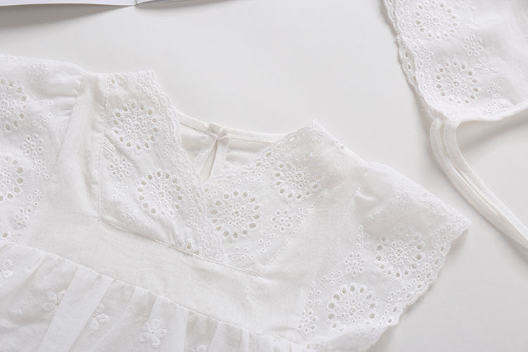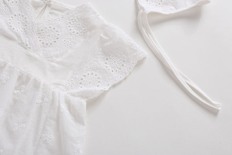 Baby Girls Solid Color Hollow Design V Collar Sleeveless Onesies Dress In Summer With Hat