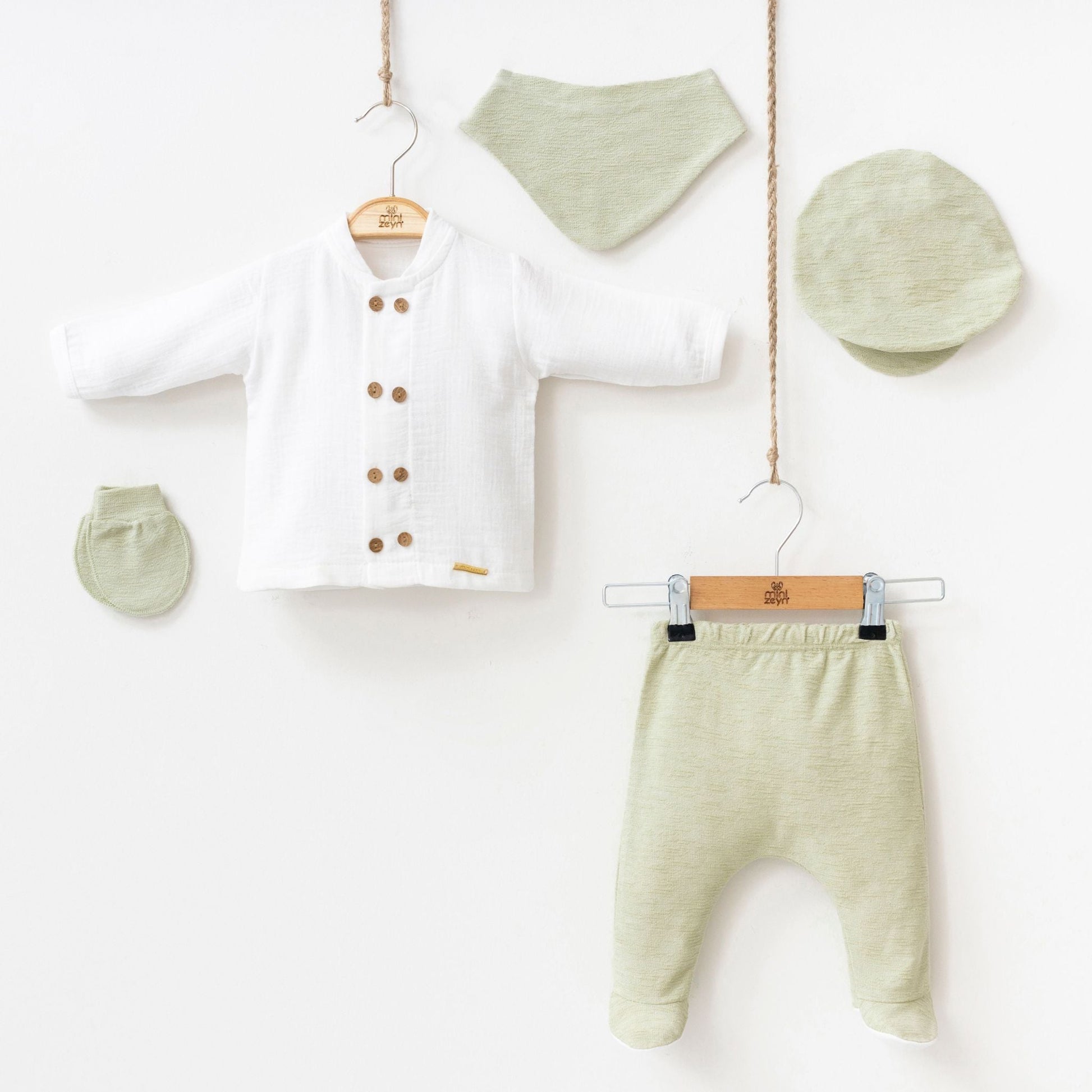 Very important to be stylish from the first day with this beautiful 5 piece pajama set that includes a soft cotton top (100% Cotton), cotton pants with closed-in feet (100% Cotton), a bib and matching anti-scratch mittens and warm hat for your new little one.