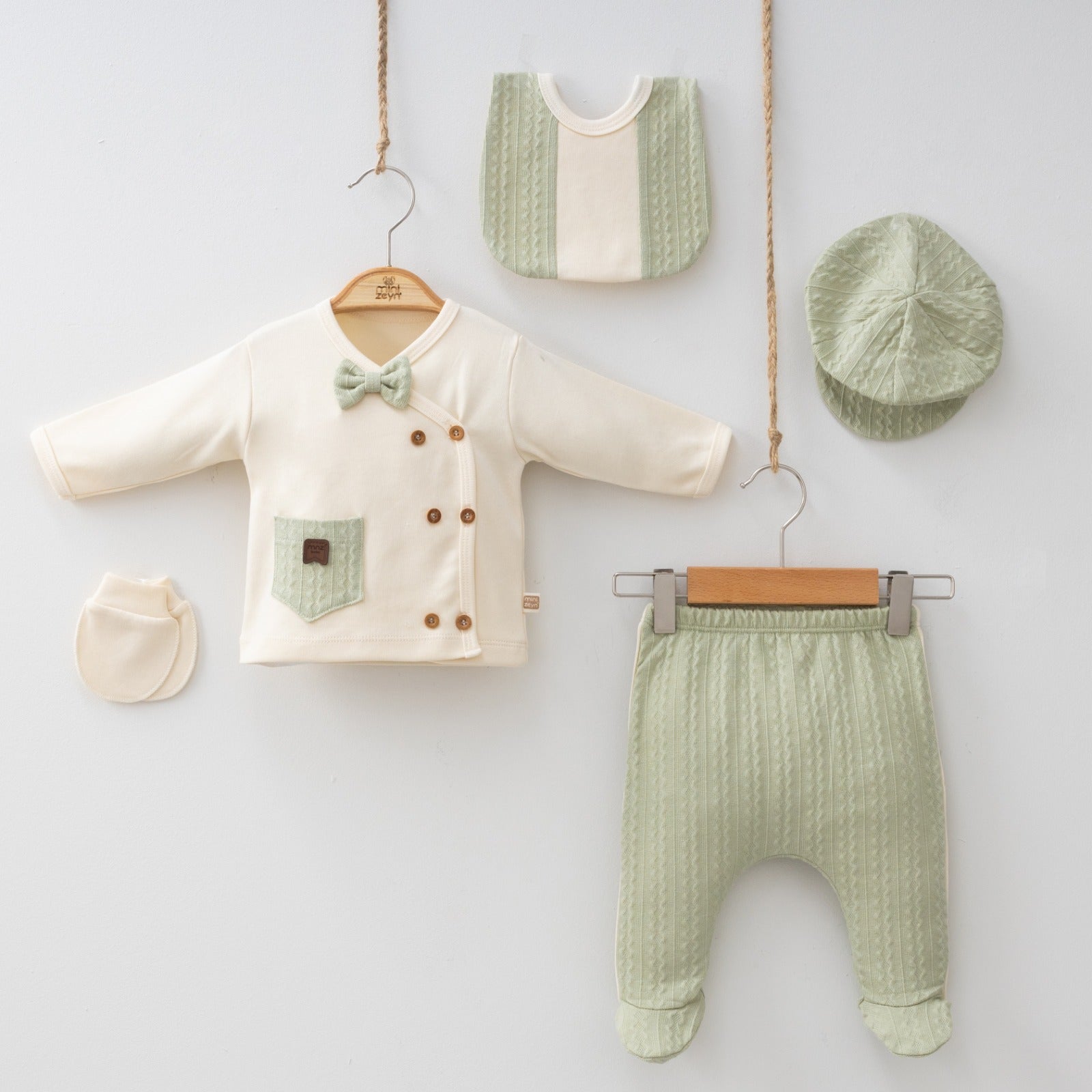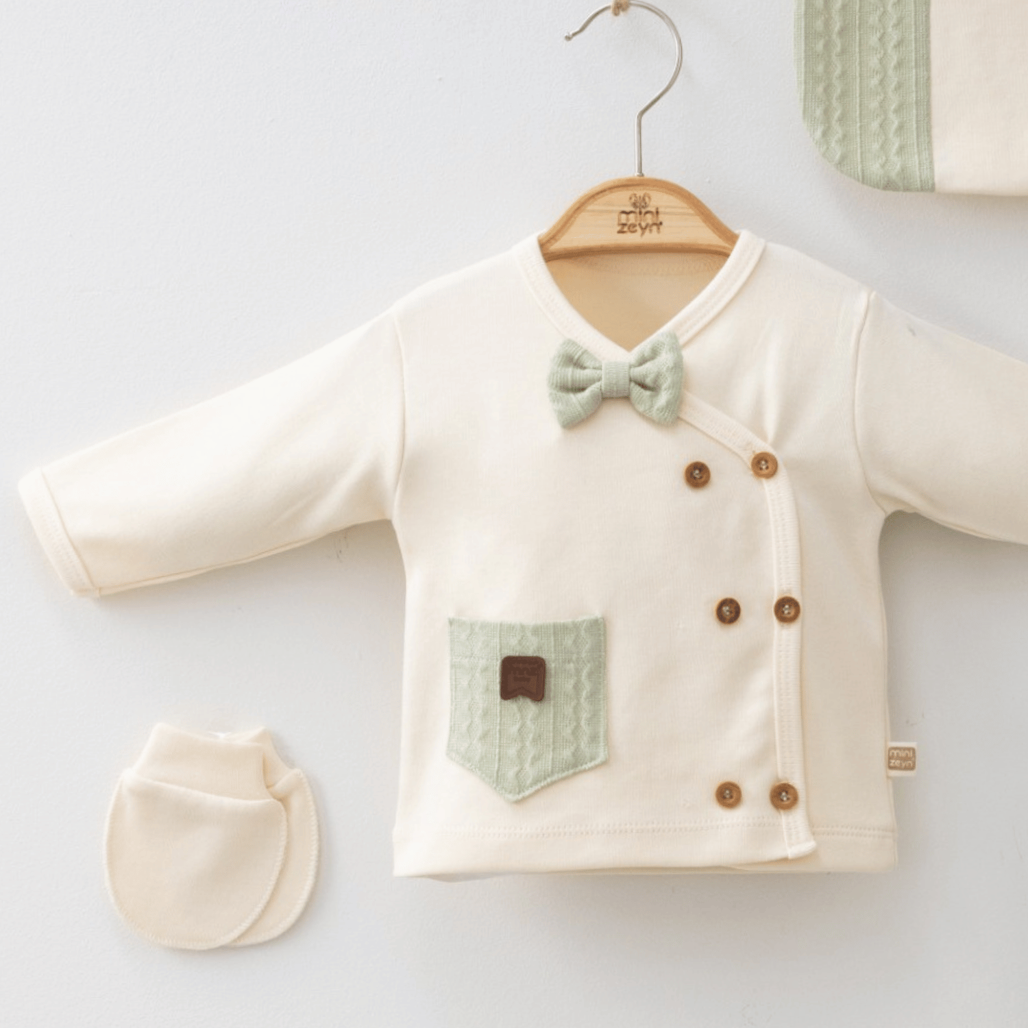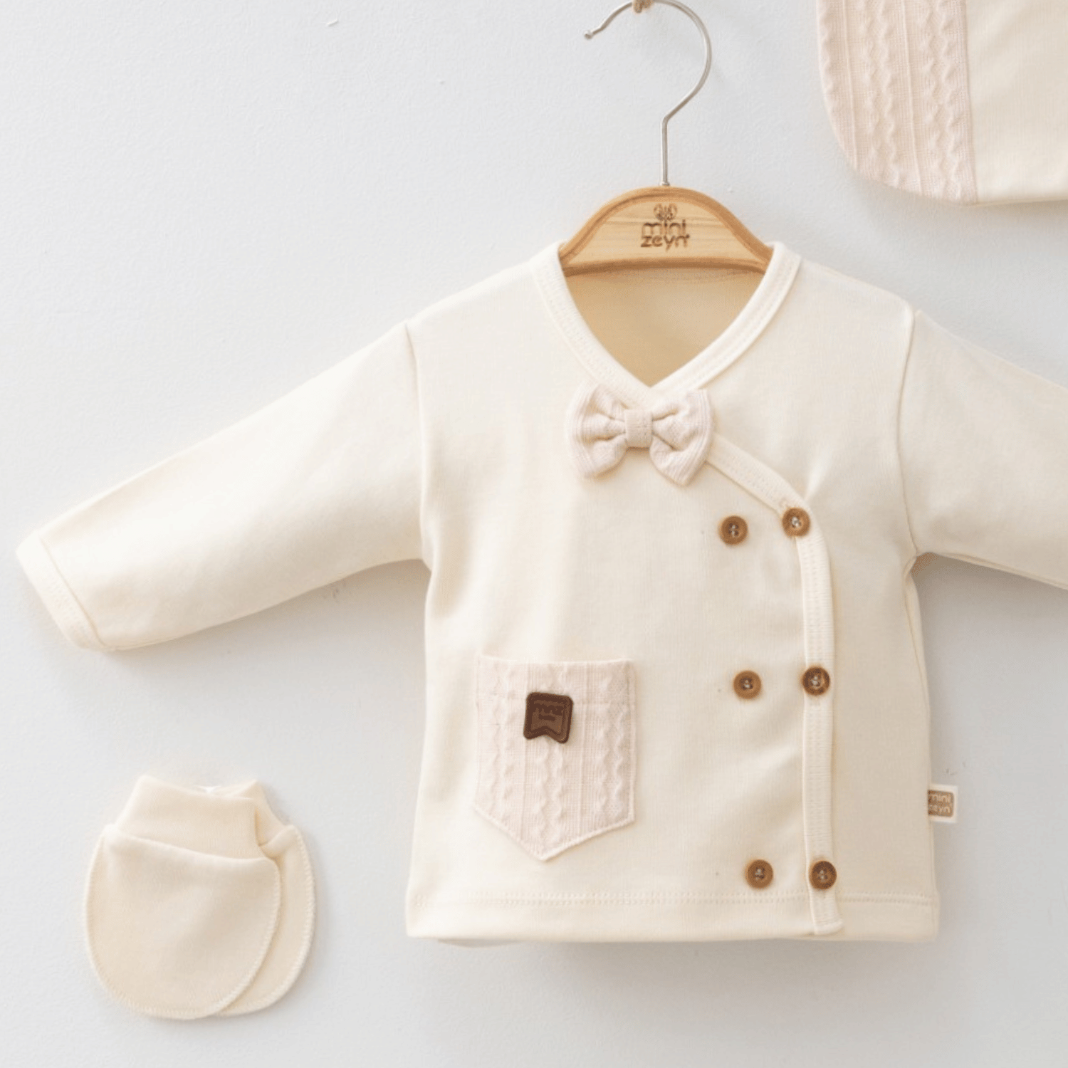 Very important to be stylish from the first day with this beautiful 5 piece themed pajama set that includes an asymmetric opening top (100% Cotton), cotton pants with closed-in feet (100% Cotton), a bib and matching anti-scratch mittens and warm hat for your new little one.